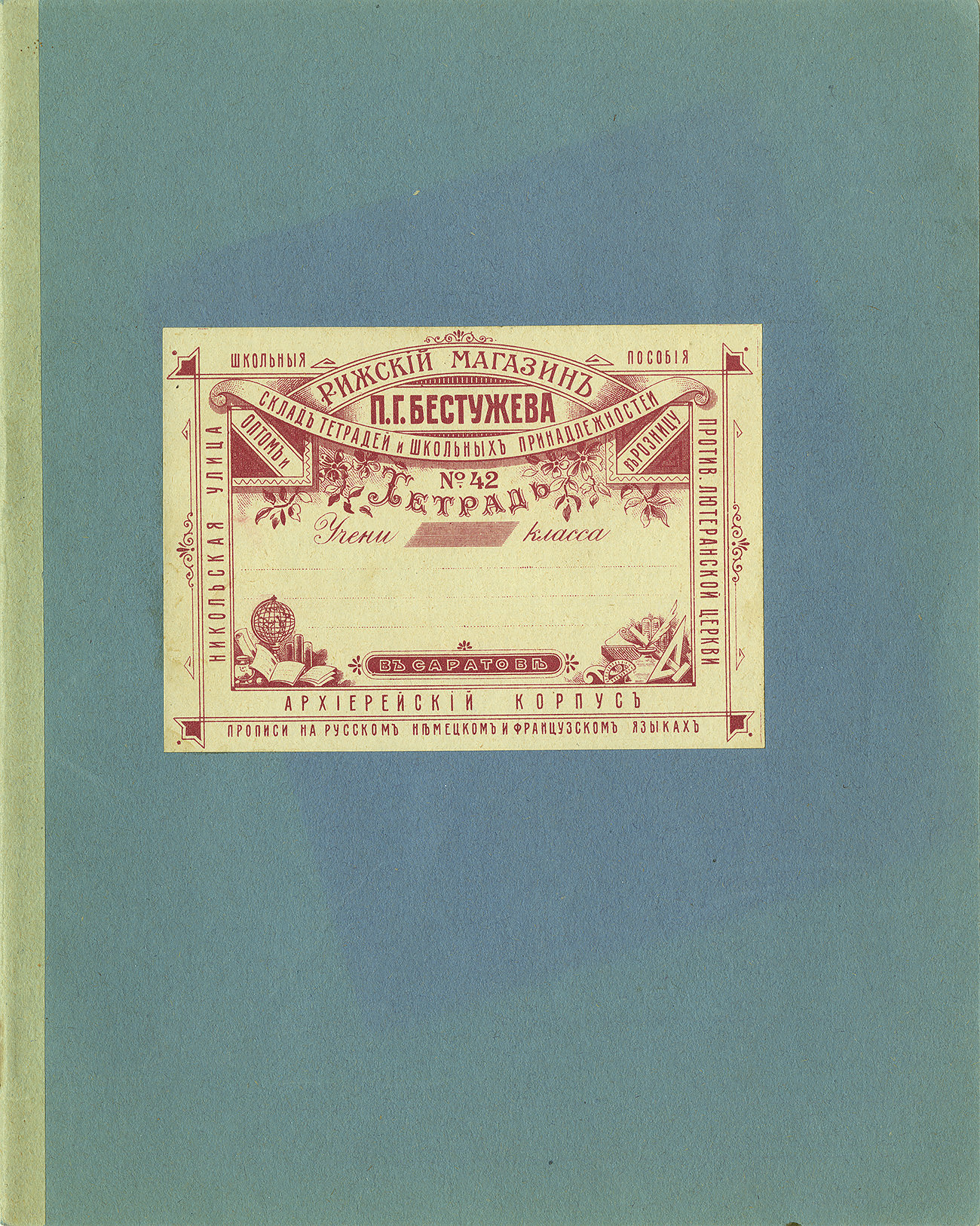 Тетрадь. Рижский магазинъ П.Г. Бестужева, Никольская улица, Архиерейский корпус, против Лютеранской церкви.