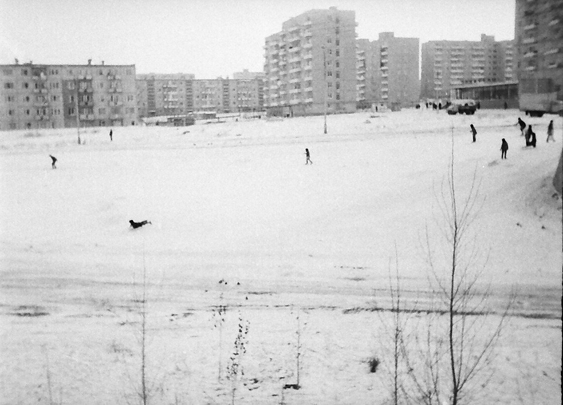 Дата 85-88, Солнечного ещё нет толком. И дороги нет. Люди идут на 12й маршрут автобуса, который ходит по Тархова, но ещё сворачивая вокруг кольца в которое упирается Лебедева Кумача сразу к тролейбусной диспетчерской. По верхней улице Тархова, сейчас против шерсти. Там и 11й маршрут ходил, и 18й. Нижнюю дорогу по ул.Тархова в 87м, по моему, построили.