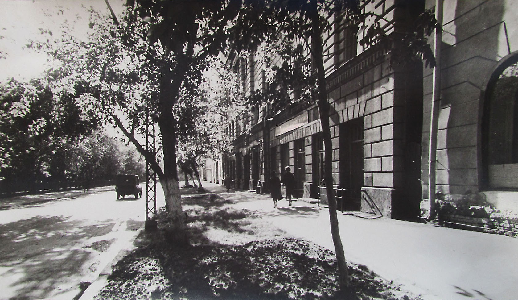 Знакомое место. Площадь Революции,5 - один из корпусов мединститута,где располагались кафедры общественных наук,большой актовый зал,аудитория на первом этаже. Одно время там базировалась кафедра эпидемиологии. Датировка -поддерживаю 1950-е годы,характерная опора и одинокий ГАЗ-69 (выпускался с 1952 г.).