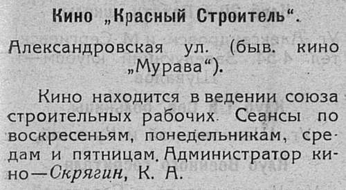 В 1911 г. в доме О.С.Кошкиной, на углу улиц Малая Казачья - Александровская (ныне угол ул. Яблочкова и М.Горького), открылся кинотеатр "Мурава. Источник: http://www.sarrest.ru/cultura/kalen/d02.html