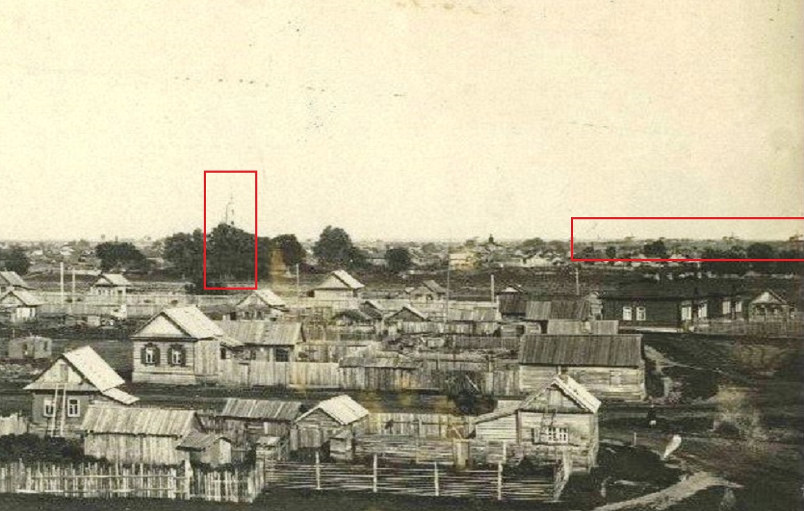 В центре фотографии точно Крестовоздвиженская церковь . Справа ветряные мельницы на возвышенности в районе 1 школы.(Мельничный поселок). Сначала думал, что это район за железнодорожной станцией, но в таком случае должны быть на снимке видны здания Костемольного завода, железнодорожного депо и водонапорная башня. Мне кажется, что фото сделано с возвышенности на Шуровой горе в районе железной дороги к переправе. Ряд деревьев находится на берегу Банного озера. Такой вариант соответствует и расположению Крестовоздвиженской церкви по сторонам света.